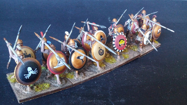 Por otro lado he pintado una unidad de Griegos de Immortal miniatures (esta pequeña marca fue absorbida hace dos o tres años por Warlord Games). El caso es que representan aliados de la Magna Grecia, es decir, soldado hoplitas de las colonias griegas en el sur de la península Itálica. Sirven tanto para los romanos como para los cartagineses o los macedonios que comenzaré dentro de algunos meses si todo va bien.