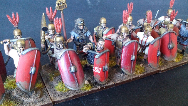 Una unidad de Principes está aún pendiente de ser pintada, pero aprovecho la oportunidad de hacer un primer plano al oficial de una de las unidades de Hastati, que es el Tito Pullo de la serie Roma. Miniatura de Warlord Games de la serie Caesarian Roman. Lleva en el escudo el número de la 13ª legión a la que pertenece en la historia de la serie y una polla como la que dibuja en una de las paredes de la celda cuando lo encarcelan.